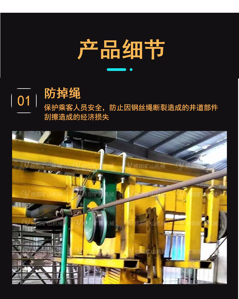 钢丝绳断绳保护器钢丝绳断绳保护装置,包括绳头板,分别安装于绳头板上的绳头组合和固定在绳头板上的支架,支架上设有光电开关,光电开关两侧分别固定一个限位架,每个限位架内侧安装一个活动托板,一个通丝两端分别穿过活动托板安装在限位架上。