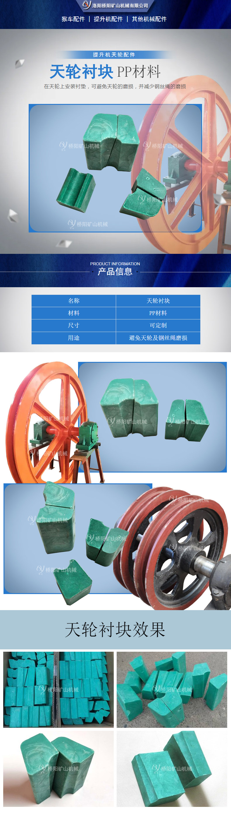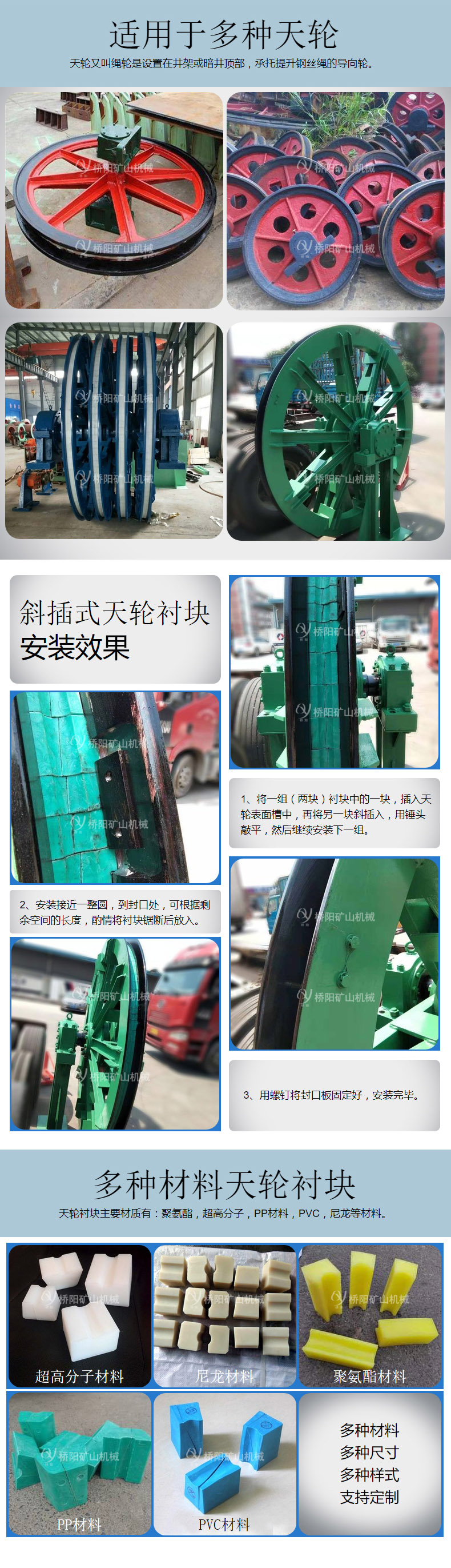 在天轮上安装衬垫,可避免天轮的磨损,并减少钢丝绳的磨损、延长钢丝绳的使用周期,从而降低更换天轮和钢丝绳的工作量。PP天轮衬块的密度较小。主要应用于单绳矿井提升机上。
