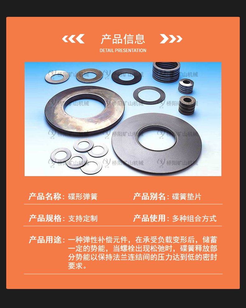 碟簧的使用安装:碟簧是一种弹性补偿元件,在承受负载变形后,储蓄一定的势能,当螺栓出现松弛时,碟簧释放部分势能以保持法兰连结间的压力达到低的密封要求。承载碟簧应力分布由里到外均匀递减。