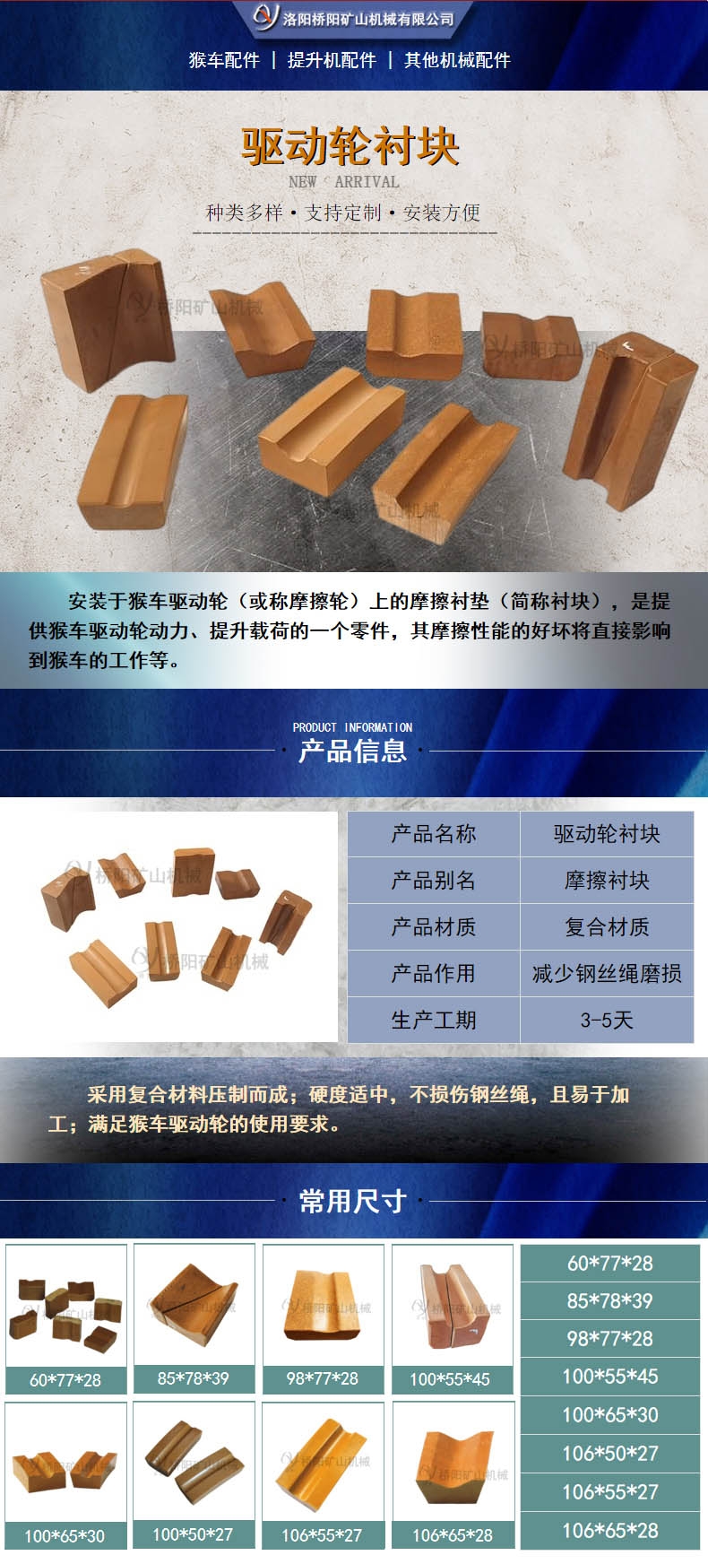 驱动轮衬块的型号主要有:106x55x27,98x77x28,106x65x30,106x66x28,98x77x28等型号。