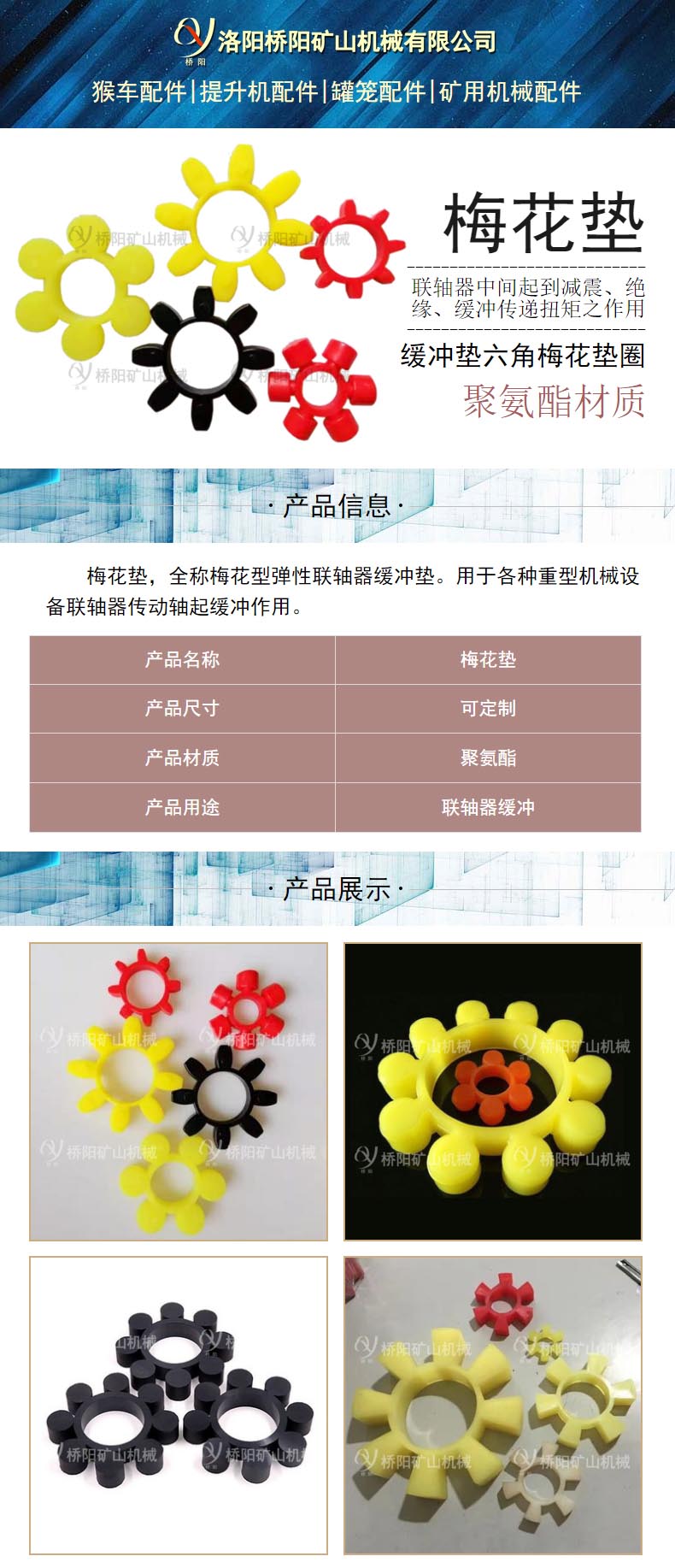 梅花垫,全称梅花型弹性联轴器缓冲垫。用于各种重型机械设备联轴器传动轴起缓冲作用。部分地区也称为梅花盘。根据材质可分为聚氨酯梅花垫和橡胶梅花垫、尼龙梅花垫。