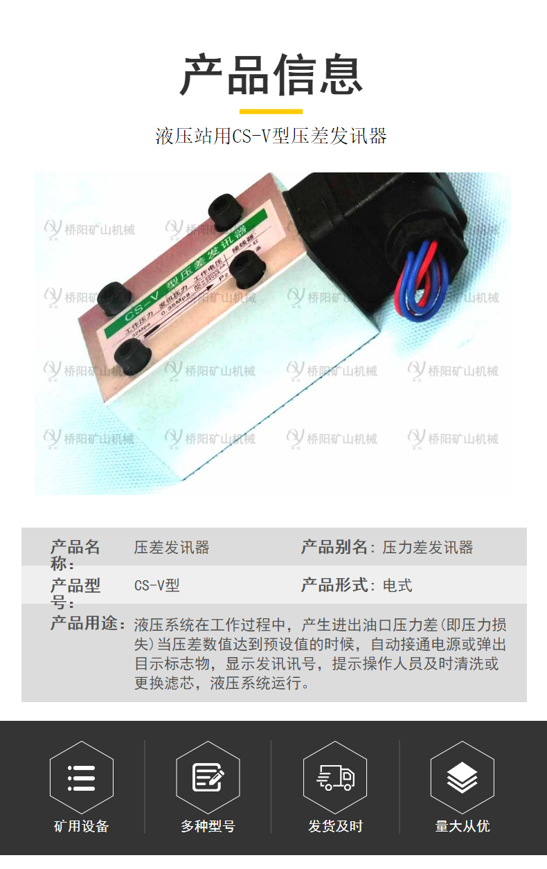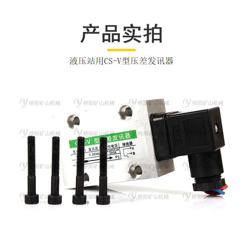 CS-V型压差发讯装置的基本作用是液压系统在工作过程中,油液中的杂质微粒被滤油器中滤芯所阻档,从而滤芯逐渐堵塞,产生进出油口压力差(即压力损失),当压差数值达到0.35Mpa时,自动接通电源,显示发讯讯号。