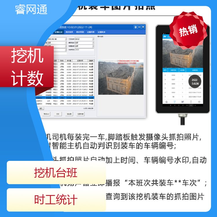 ????睿网物联挖机智能计数终端采用云计算结合物联网技术进行信息采集和数据分析,通过照片留证的方式降低人为误差的影响,数据自动采集,大大降低了外部因素对数据客观准确性的干扰,也降低了数据采集和统计的工作量。同时前端设备信息实时同步也让挖机作业情况随时随地可查,从而解决挖机管理中存在的各种问题。