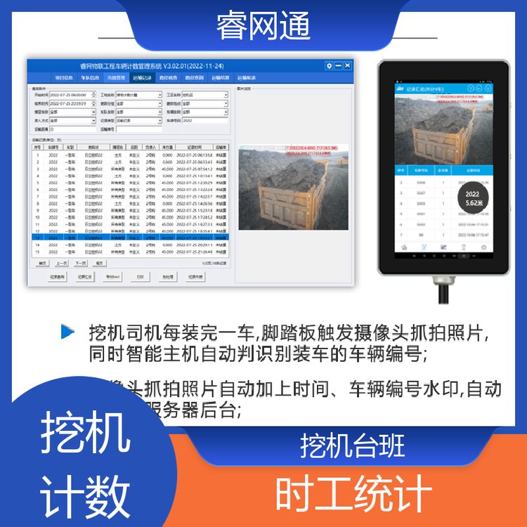 ????睿网物联挖机智能计数终端采用云计算结合物联网技术进行信息采集和数据分析,通过照片留证的方式降低人为误差的影响,数据自动采集,大大降低了外部因素对数据客观准确性的干扰,也降低了数据采集和统计的工作量。同时前端设备信息实时同步也让挖机作业情况随时随地可查,从而解决挖机管理中存在的各种问题。