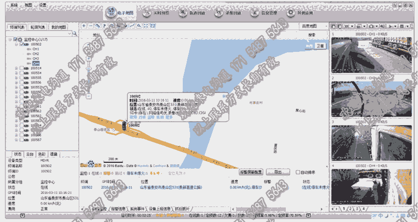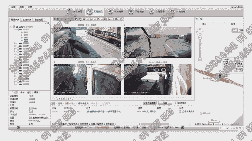 软件平台具有中央监控和网络管理系统,将“货车/物流车”的视频、声音、北斗GPS卫星定位同步实时传输到监控中心,实现以画面双显示,显示远程传输的实时视频+北斗卫星、GPS卫星定位在电子地图的车辆所在位置及行驶信息,接受 “货车/物流车”上传输回来的视频、声音、北斗定位信息,监控中心管理人员在画面上就能实现同步看到、听到、知道、控制得到的实时管理。