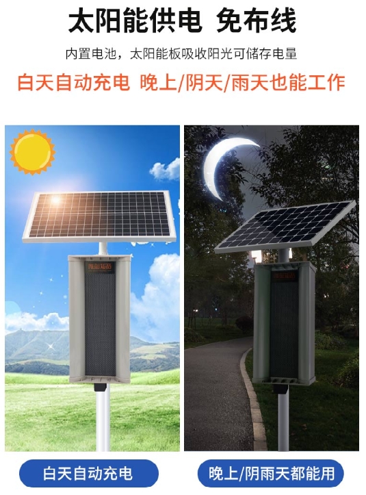 低功耗设计,户外太阳能供电使用时间更持久,待机时间更长。体积小巧,安全方便。带红蓝灯,声光一体。三种感应模式可调,适合安装在各种场合。