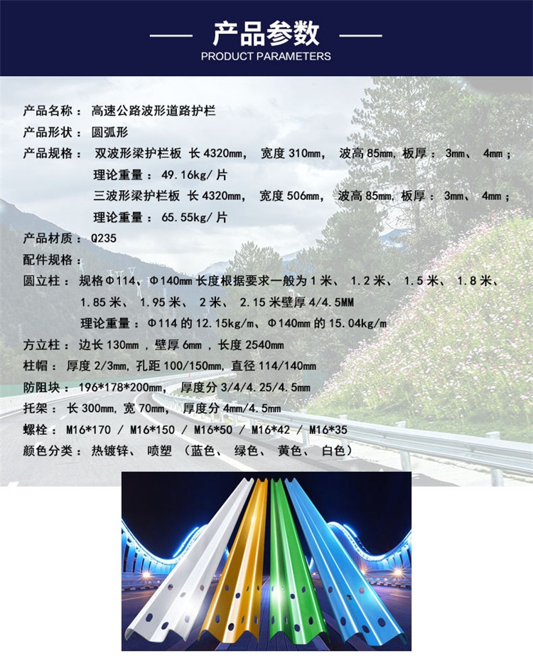 我们的主要业务包括:高速公路护栏板、波形护栏、桥梁护栏的生产、销售与安装。我公司引进先进的冲压、切割、磷化、冷镀锌、热镀锌、大型静电喷塑等全套生产设备。产品通过了工程监理检测中心(国家交通安全设施质量检测中心)的验收,全部符合:交通行业标准JT/T281—2007《高速公路波形梁钢护栏》、国家标准GB/T18226-2000《高速公路交通工程钢构件防腐技术条件》。年生产能力为15万吨.