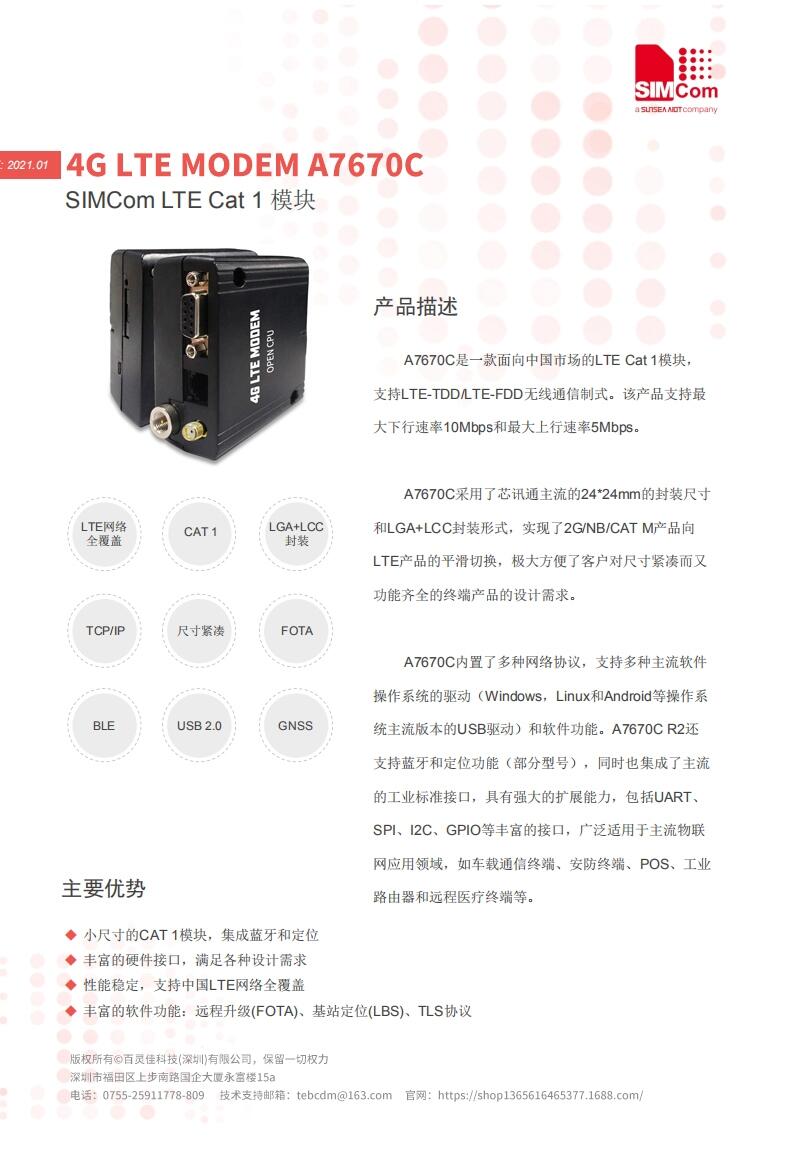 A7670C是一款面向中国市场的LTE Cat1模块,支持LTE-TDD/LTE-FDD无线通信,该产品支持下行速率10Mbps和上行速率5Mbps。