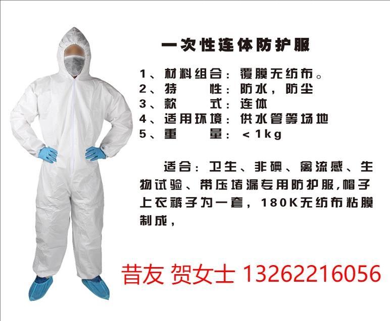 一次性连连体防护服: 卫生、非碘、禽流感、生物试验、化工堵漏防护服,帽子上衣裤子为一套,