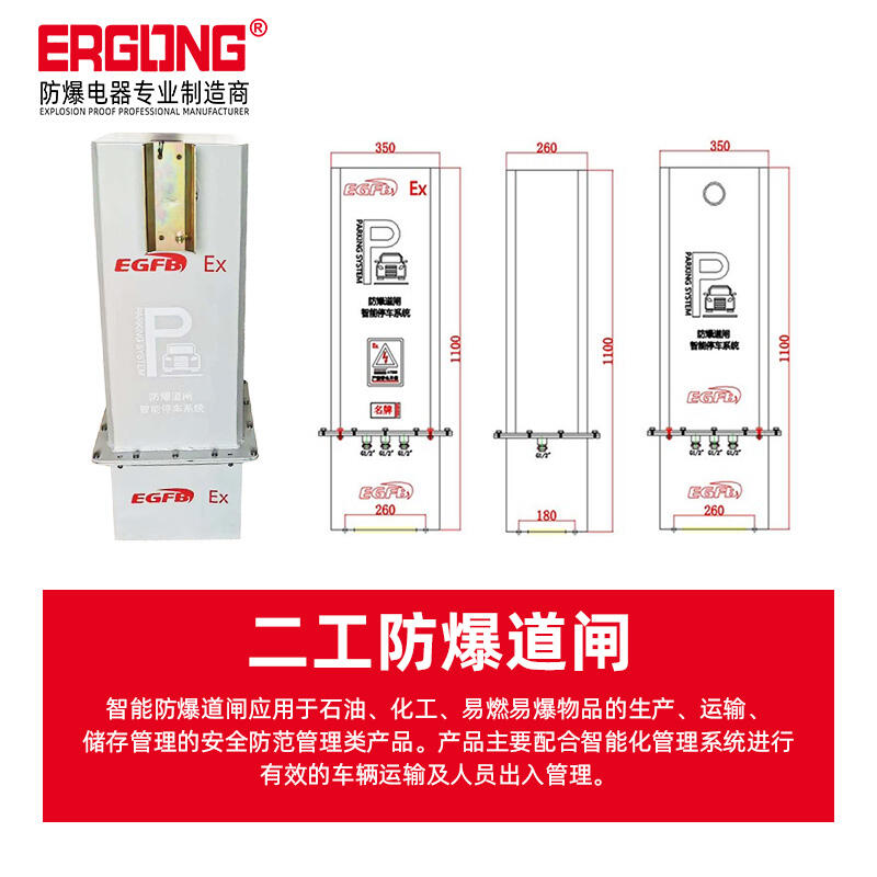 EGDZ-智能防爆道闸,内部采用无刷道闸产品,本产品是一种典型的机电一体化产品,其以体积小、防爆性能好、噪音低、、调速广、稳态转速误差小等特点。四代减速箱,道闸,多速比可选择,运行平稳,定制齿轮传动效率更高,稳定性高,采用新模具设计技术,钢材折弯焊接成形,无刷控制调速技术,左右可快捷互换,无离合设计,质量更加可靠,使用更加方便,机芯采用齿轮传动速度快、弧形曲臂三连杆结构,起落杆快速平稳。维护方便、使用寿命长。