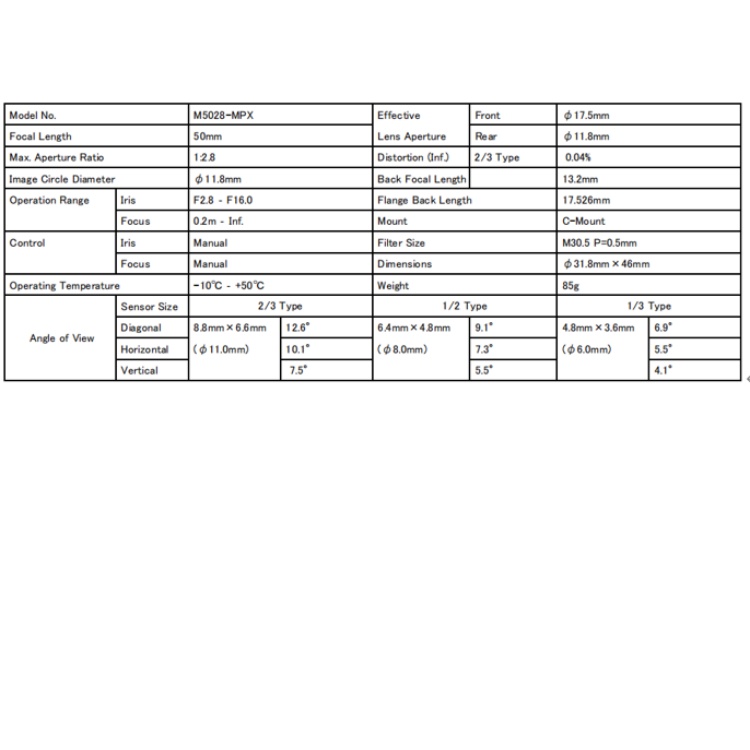 M5028-MPX Computar 1600万2/3英寸50mm工业镜头 镜头焦距50mm 靶面尺寸2/3英寸 光圈范围F2.8 ‐ F16.0 手动光圈手动聚焦 对焦范围0.2m ‐ Inf  工作温度-10℃ ‐ +50℃ 低畸变0.04% 后焦距13.2mm 安装C接口 尺寸φ31.8mm×46mm 重量85g M5028-MPX