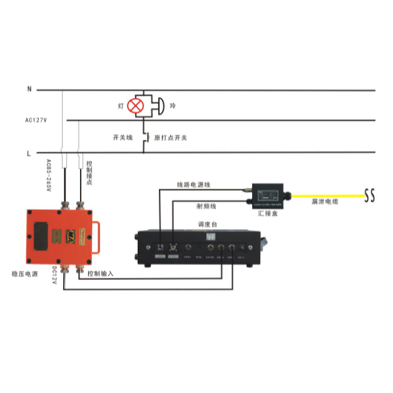 b) 将稳压电源的电源线接好(供电范围AC85V~265V)。控制接点为一无源触点开关,接到原打点开关上(并联)。当调度台收到手持机打点一次,控制稳压电源内部继电器接点吸合一次,以达到开关控制功能,实现灯铃控制。