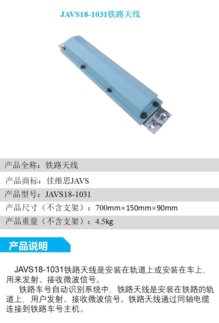 JAVS18-1031铁路天线是与铁路车号自动识别系统配套使用。铁路天线是安装在轨道上,用来发射微波信号,铁路天线同时接收铁路车号电子标签的反射回来的信息。