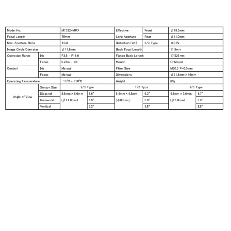 M7532-MPX Computar 2/3英寸1600万75mm工业镜头 定焦75mm 光圈范围F3.8 ‐ F16.0  C接口 最小工作距离(mm) 0.25m 最大孔径比:1:3.8 像圈直径:φ11.8mm 畸变(%)  2/3英寸 0.01% 法兰后焦距:17.526mm 产品尺寸:φ31.8mm×46mm 产品重量:89g M7532-MPX