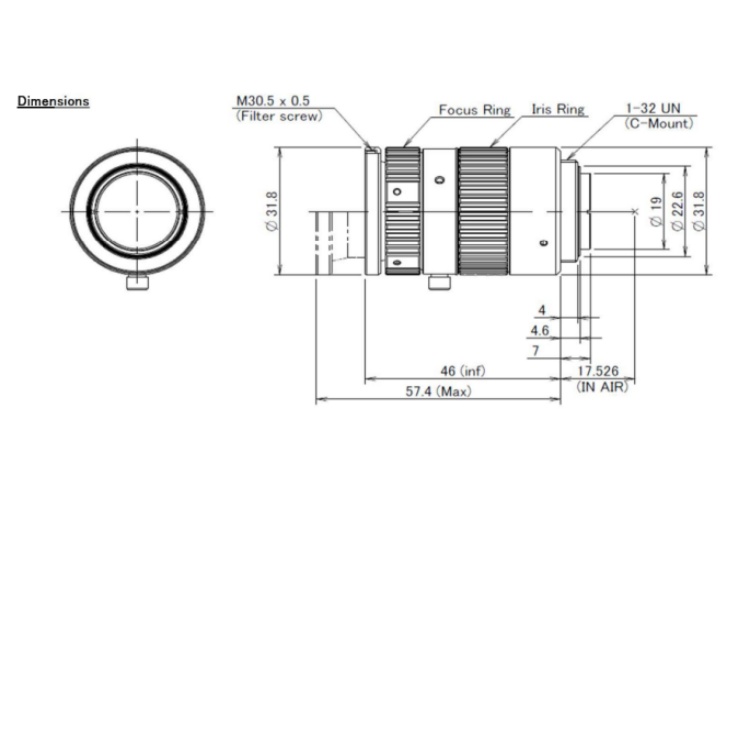 M7532-MPX 日本Computar康标达1600万像素2/3英寸75mm定焦光圈范围F3.8 ‐ F16.0 C接口机器视觉工业镜头 尺寸图: