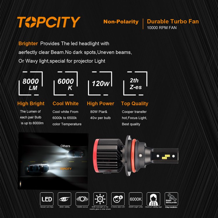 供应车灯LED汽车灯泡 9004/9007远近光切线前大灯直插式风扇头灯 品牌TOPCITY/光亮一号