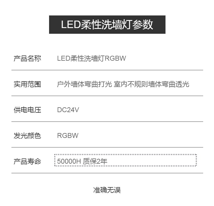 本产品是一款LED 低压柔性洗墙灯,采用了SMD5050 LED作为光源。LED排布距离42PCS/M, 6个灯形成一个回路、每隔120mm可任意剪断 ,每一组都可以单独正常点亮实用;LED显指Ra大于90;2835属于贴片型光源,尺寸为5.0MM*5.0MM的方形,故为5050型号;FPC板采用50铜双面板作为基板,具有良好的导电性能,表面采用环保覆膜材料,不漏电,保证安全;底部采用导热双面胶材质,具有导热性、粘性强等特点。