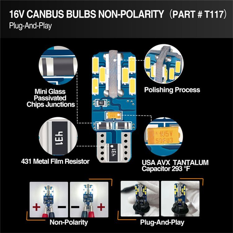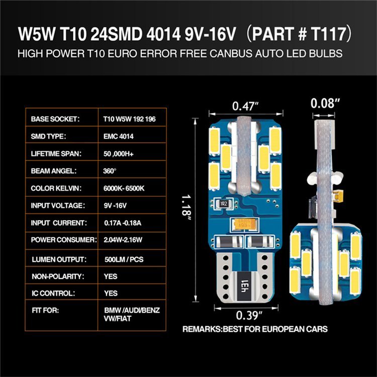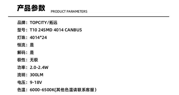 产品规格 | T10 4014 24SMD CANBUS | ||