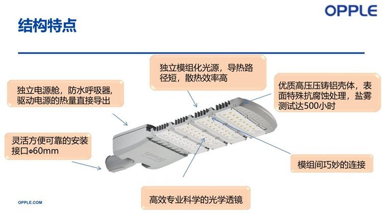 欧普照明轩宵LED路灯采用PC透镜抗紫外线强,配光科学舒适,出光效率高