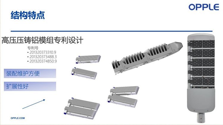轩宵LED路灯外观采用专利高压压铸铝模组设计,功率大小可组合调整,