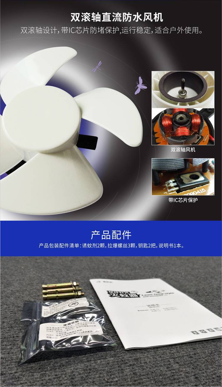 全新草坪灯式灭蚊器使用不锈钢机身,工业设计造型美观,具户外照明、灭蚊、环境装饰一体化功能。运用生物诱蚊技术和物理灭蚊设备,采用光波 气味 热感模拟引诱蚊虫靠近,高速旋转的涡流风机将蚊虫吸入储蚊网兜并风干至死,安全防水。适用于物业小区、别墅花园、学校灭蚊从而达到绿色除虫、环保灭蚊的目的。