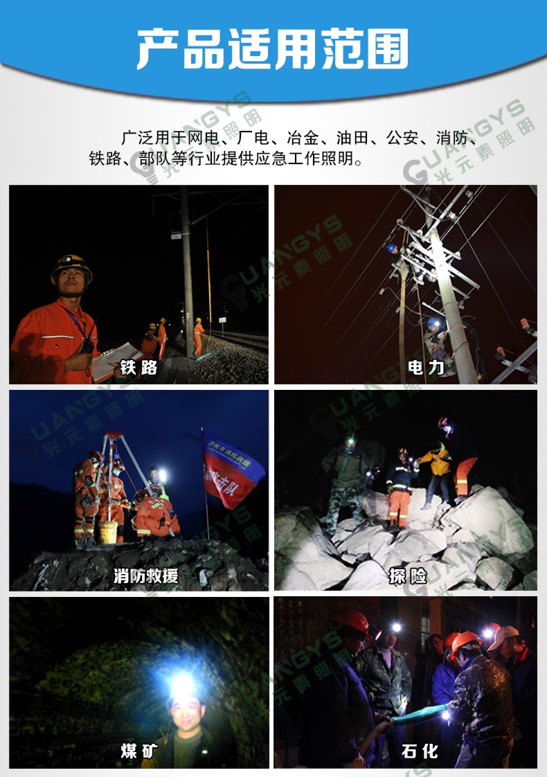适用环境广泛用网电、厂电、冶金、油田、公安、消防、铁路、部队等行业提供应急工作照明(1区、2区)