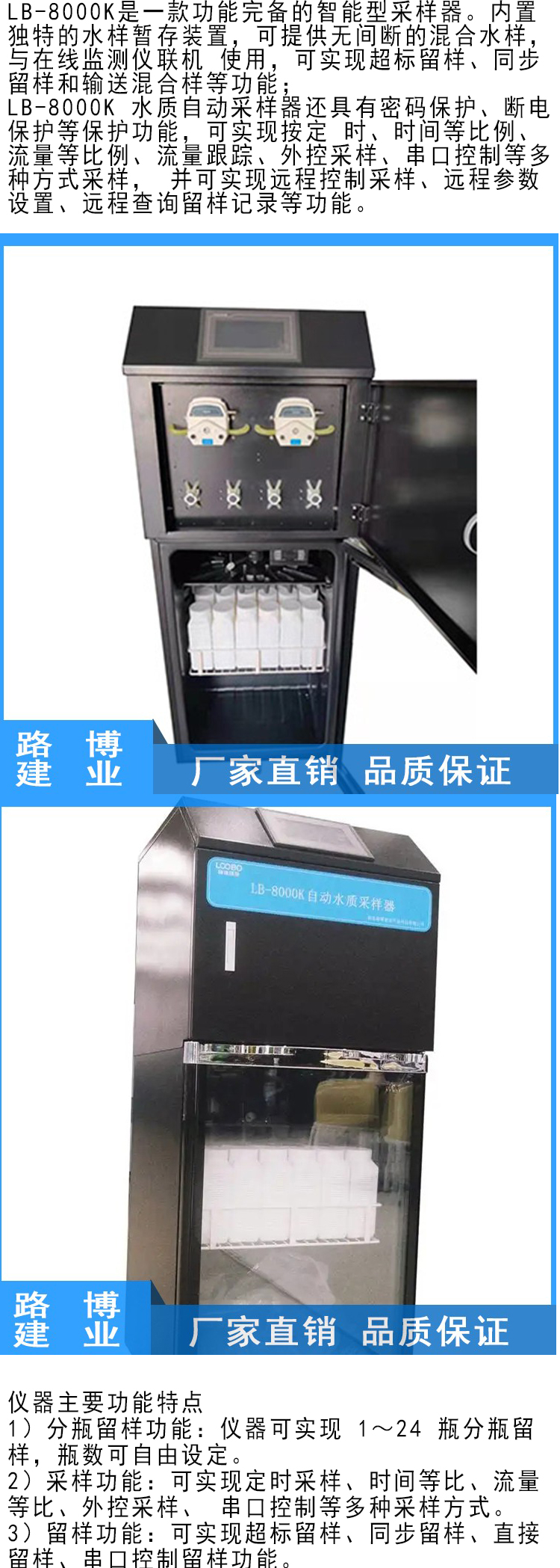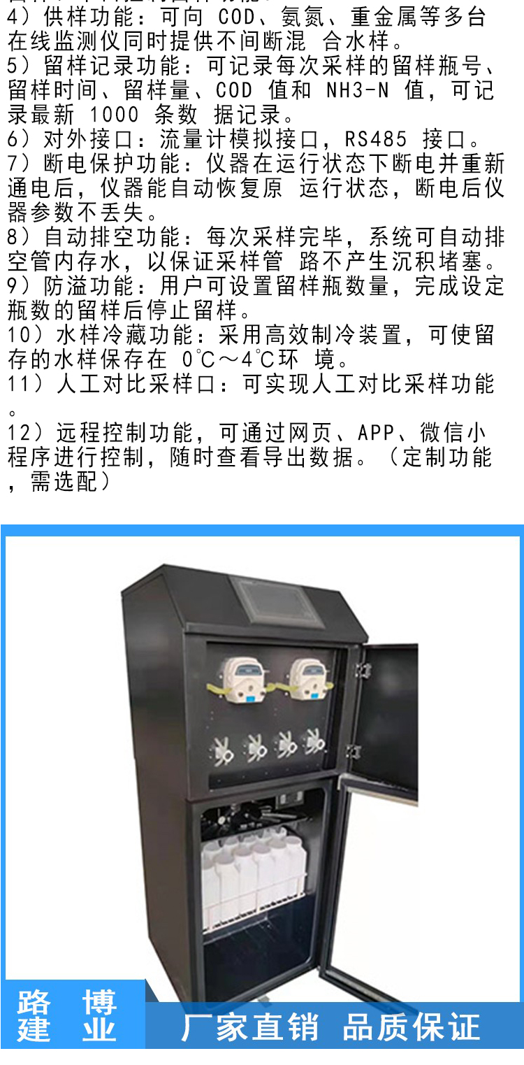 功能 | 内置独特的水样暂存装置,可提供无间断的混合水样,与在线监测仪联机使用 | ||