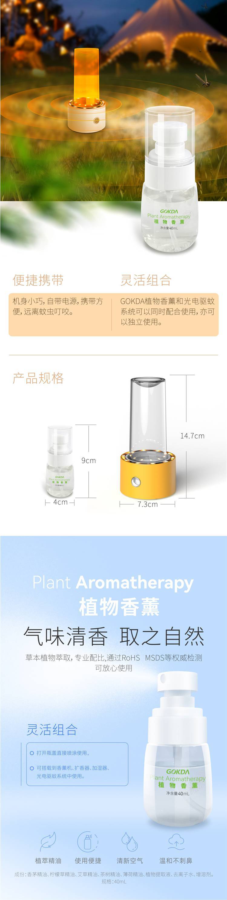 户外:在户外可以采用光电驱蚊系统搭载GOKDA植物香薰进行驱赶周边蚊虫;