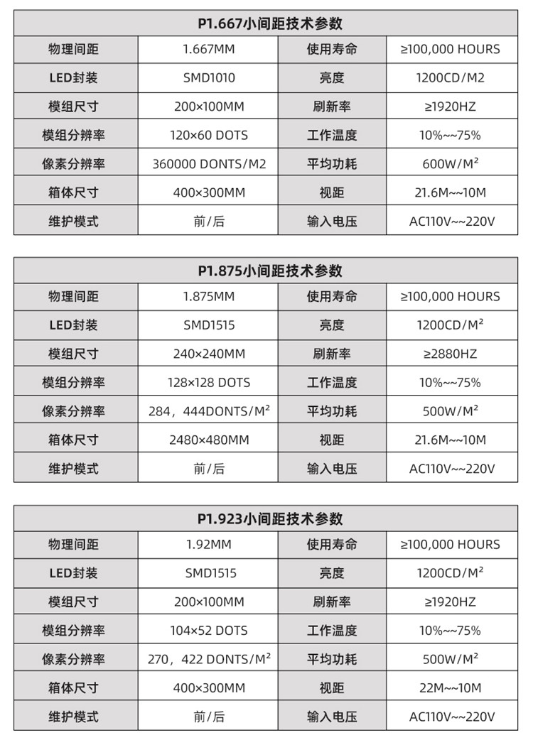 像素间距 | P1.25/P1.57/P1.53/P1.86/P2/P2.5(可定制) | ||