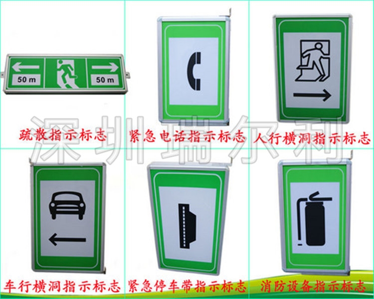 LED隧道电光标志分为疏散指示标志,紧急电话指示标志,消防设备指示标志,行人横洞指示标志,行车横洞指示标志,紧急停车带指示标志等。符合国标《JTG D70_2-2014公路隧道设计规范第二册交通工程与附属设施》,是一种高亮度长寿命超节能的新型隧道电光标志。
