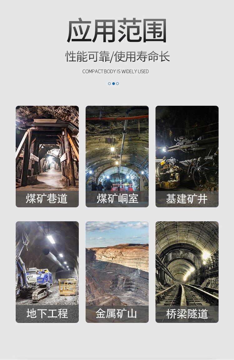 矿用隔爆型LED巷道灯外壳采用铝材高压铸造成型,表面粉末静电喷涂及钢化透光玻璃罩的一体设计,内置高流明、大功率LED光源,宽输入、的开关电源,是一种体积小、重量轻、寿命长 免维护、节能、安全性能好的绿色环保型巷道灯。可用于煤矿井下照明、也可适用于隧道、地下照明场所和化工生产场地的照明。隔爆型LED巷道灯功耗极低, 耗电量仅为传统光源的10%~20%。