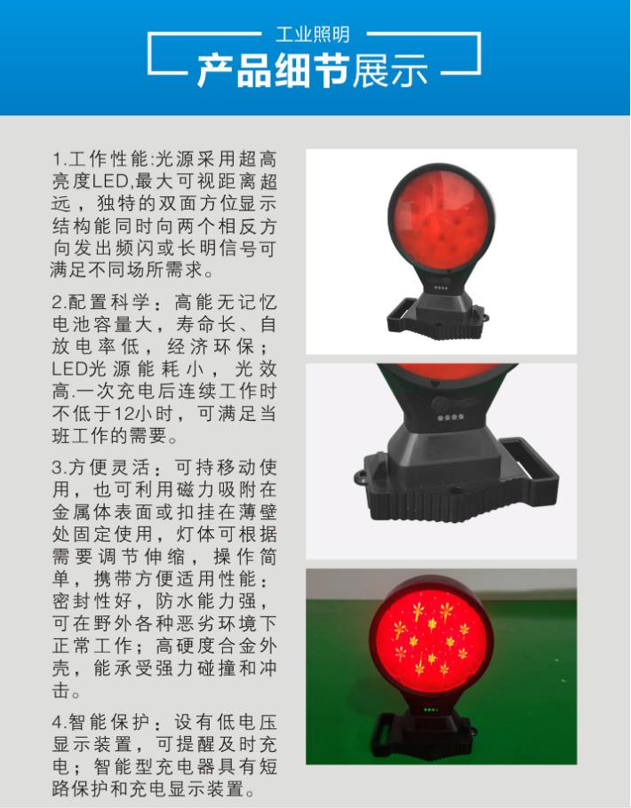 1.光源采用 亮度LED, 能同时向两个相反方向发出长明或频闪(A型)警告、信号或显示方位,单向大可视距离为1500米