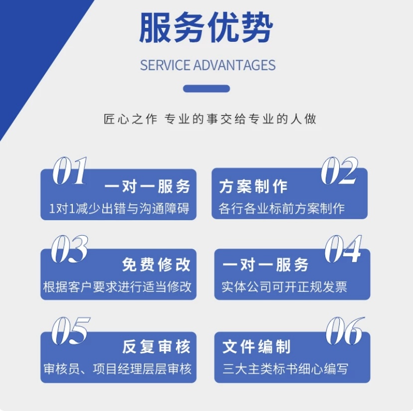 中标率高:我们有着丰富的标书制作经验和技能,能够精准把握评标标准,为您提供 优质的标书方案,从而提高您的中标率。