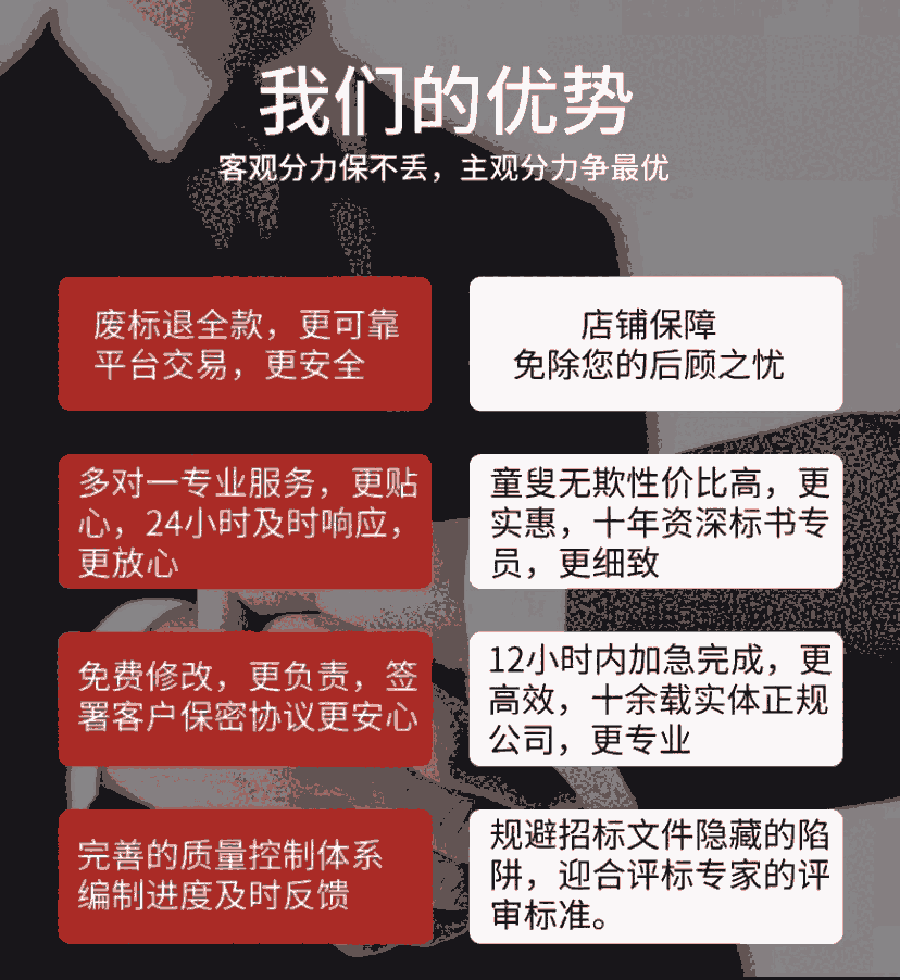 依照技能方案的目录逐一完善内容。在这儿需求表达的一个观念:技能服务方案和商务、经济部分最大的不同便是没有客观的,都是片面内容,所以评分专家起到了很大的作用。标书制造技巧。总准则是“减量法”,专家在评审进程中尽可能阅读较少的内容就能为投标文件进行安全、高效、精确的评分。整理出4个方法: