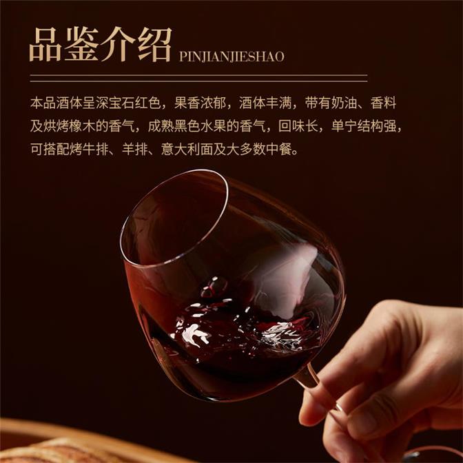 人工原生态种植,不打农药,不施化肥,控温发酵,酒体呈深宝石红色,果香浓郁,带有奶油、香料及烘烤橡木香强劲,回味悠长,适合搭配牛排、羊排及中餐。