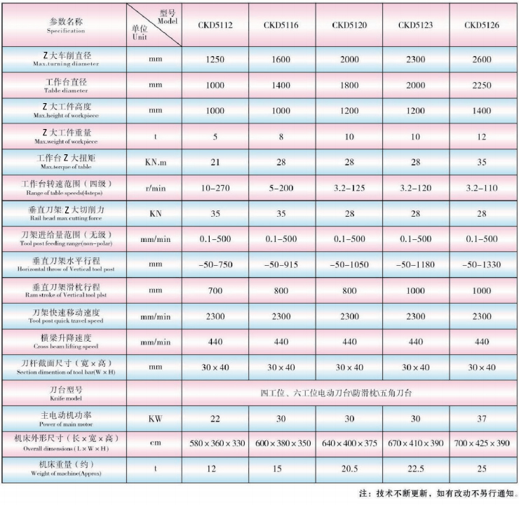 4、CKD5112、CKD5116两种机型,工作台采用滚动轴承导轨,主轴采用高精度圆锥孔双列圆柱滚子轴承,主轴轴向间隙采用推力球轴承调节,极大提高了承载能力,运行速度更快,加工精度有质的提升,变速箱也重新设计,加大齿轮模数,齿面加宽,齿轮重合度增大,相应传动轴,轴承也有提升,具有承载能力大,耐冲击,抗摩擦,运行平稳,使用寿命长,运转速度比普通立车高,加工精度高等特点,特别适合火车轮,桥梁支座等断续切削,重切削加工。