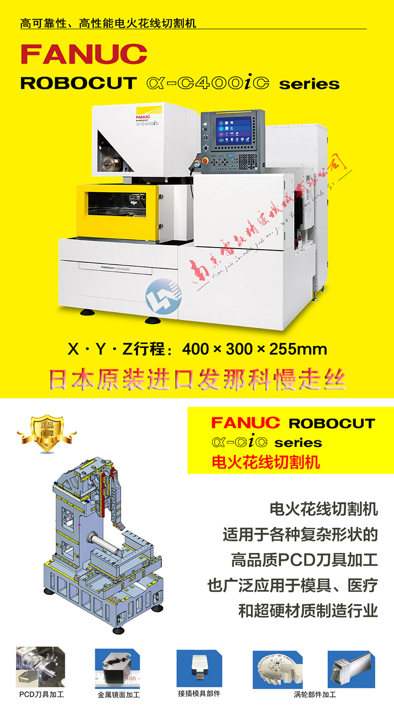 发那科慢走丝(FANUC慢走丝)型号:α-C400iC、α-C600iC、α-C800iB、发那科慢走丝所有机型均为日本原装进口,所有机型提供36个月保修。配合FANUC系统、温度补偿、固定料芯、三维坐标旋转、**准自动穿丝、实现高品位切割加工。