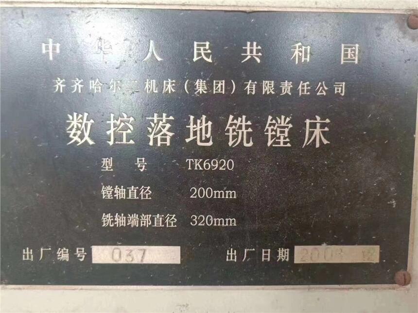 齐齐哈尔数控落地镗铣床,TK6920/40x12加工高度4米,长度12米,铣杆直径200mm,镗轴端面320mm,W轴1.2米,Z轴1.2米,数控回转台2.5X3承重40吨,西门子840D系统,带3个铣头,平旋盘,安装少用,三轴全闭环,2006年产,安装少用在位出售,