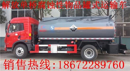 解放单桥八类危险品罐式运输车罐体配置:罐体材料 :Q235B碳钢,不衬塑碳钢罐罐体是6mm碳钢板,衬塑碳钢罐罐体是5mm碳钢板,罐体内部是16mm 衬塑PE(聚乙烯),封头是6mm水压涨形封头,罐体内部带双层波纹形组浪板,罐体顶部带升降护栏和保护装置(防撞杆,接散盘,呼吸阀),总阀:不锈钢海底阀(紧急切断阀门),后尾部左右自流配2个3寸球阀