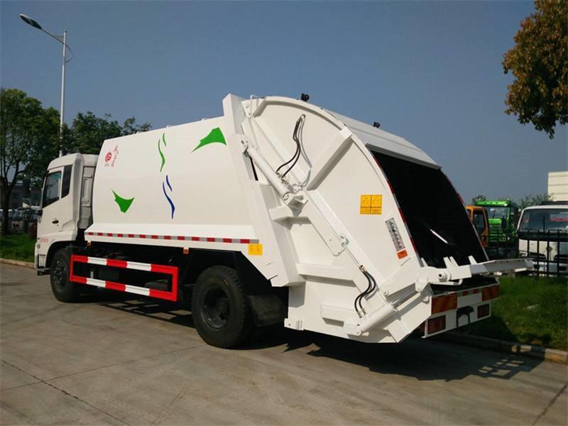 当压缩式垃圾车填料斗装满垃圾后,刮板打开,滑板带动刮板一起向下移动,插入垃圾中进行破碎和首次压缩,刮板向前回转,进一步压实垃圾,刮板到位后随滑板向上移动,将垃圾压实并装填到垃圾箱中,然后回到起始位置。整个工作过程自动控制,在垃圾连续不断的压填时,推铲在挤压力的作用下,克服背压逐步后退,实现垃圾双向压缩并均匀充满整个垃圾箱。当压缩垃圾车在处理(或填埋)场卸出垃圾时,举起填装器,推铲向后移动,沿水平方向将垃圾箱里的垃圾推出。