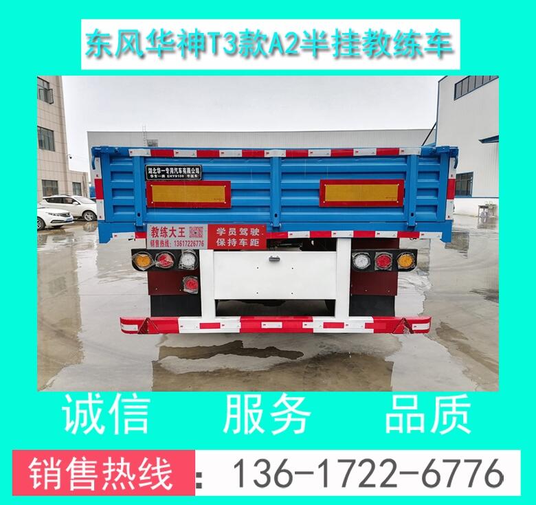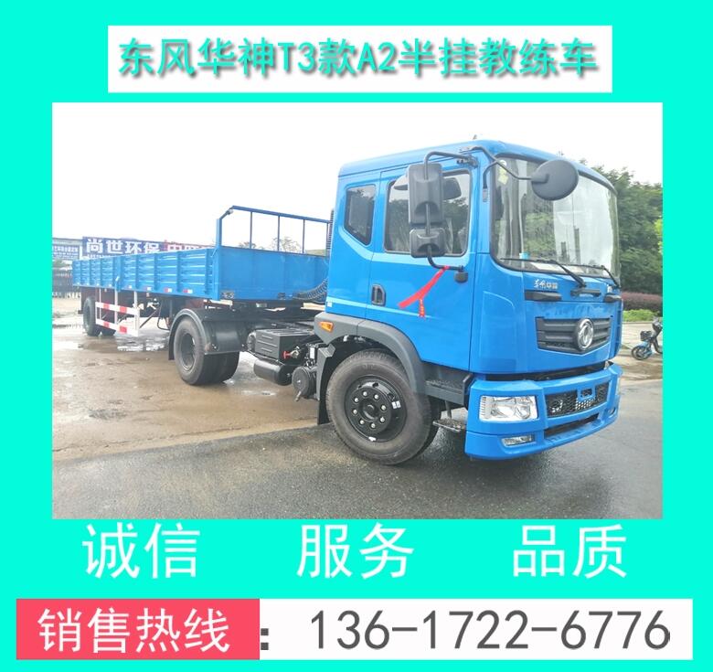 3、东风华神DV3平头A2半挂教练车主要配置:牵引头部分配置:东风华神DV3驾驶室,玉柴YCY24120-60(120马力,国六后处理)发动机,万里扬五档箱(带换挡配重块,后置副变速),9.00R20轮胎,减震可调学员座椅,前后可调教练座,年轻豪华仪表台,遥控钥匙,标配原厂空调及遮阳罩,高亮度转向灯,LED日间行车灯,整体式加宽后视镜,前下补盲镜及两侧下视镜,耐磨地垫,副刹车、副喇叭,副倒车镜,行车记录仪。轴距:可选3300mm、3400mm、3500mm、3950mm,232mm直通梁单层大梁,前桥3.6T、后桥7T,断气刹,离合助力,方向助力(转向油管带降温盘管,转向机带行驶泄压阀),发动机前悬置结构加强(采用双螺杆结构,增加软垫刚度),加大打气泵,全车制动系统采用德国品牌WABCO(制动阀、干燥器),德国VOSS(气路管路及接头),165A大电瓶,铝合金油箱,铝合金储气罐,原厂ABS,50#鞍座,灭火器。随车工具一套。挂车部分配置:牵引车型号:EHY9100,配50#牵引销,外形尺寸:8315×2500×2500(mm) ,带ABS,自动调整臂,8吨单轴,箱板高度为550(mm),其它标配。