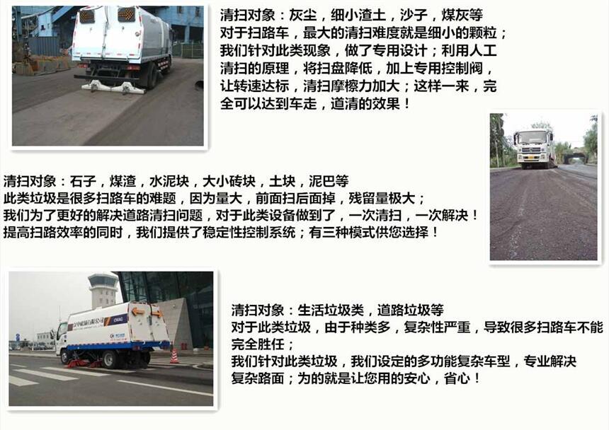 3、增添形象,提高品味:扫路车是目前市政企业提高形象的法宝之一,不管是老百姓,还是重要客人,还是公司员工,看到您将原始的人工清扫换为扫路车来执行,您想象一下!百姓感觉政府有能力了,远道来的领导客人等觉得有实力了,员工看到觉得公司靠谱了,小区的业主们觉得放心了;扫路车是目前行业的设备源于此。