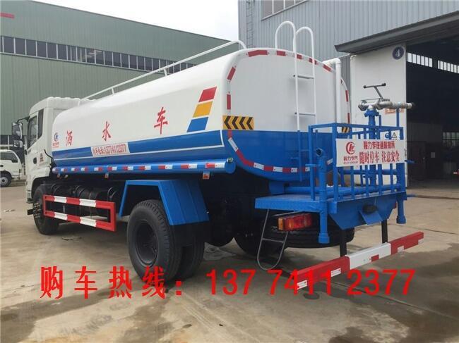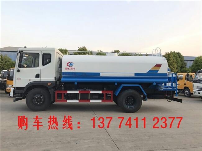 洒水车罐体材质为Q235国标碳钢,厚度为4MM,带大功率专用洒水泵,前冲、侧喷、后洒,带后工作平台和洒水高炮,高位花洒。