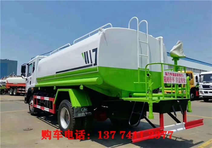 洒水车前冲(喷)后洒,带侧喷,罐体后带工作平台,平台上安装绿化洒水炮,洒水炮可旋转,可连续调成直冲状、大雨、小雨、毛毛雨,带安全护栏,配备全国质量评比名的杭州威龙大功率专用洒水泵,泵可自吸自排,安装过滤网,带消防接口,可通过消防栓进水,带自流阀,随车选装20米绿化卷盘,可喷洒农药,罐体金属漆。