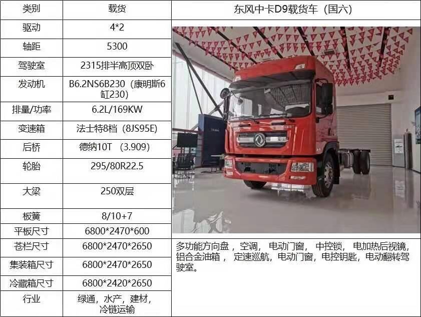 国六,东风多利卡D9,5300轴距,小八档,玉柴200马力或康明斯230马力,295真空胎或1000钢丝胎,10吨后桥,平顶或高顶双卧驾驶室。
