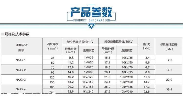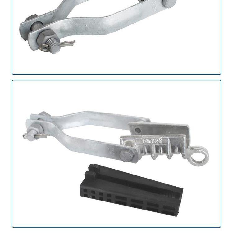 NXJ系列适用于10KV及以下架空绝缘铝芯线的终端货耐张段两端和绝缘子串一起,将架空绝缘导线固定和拉紧。产品按导线规格分别配有不同的塑料楔芯。 结构特点:1.壳体采用抗氧化高强度铝合金铸造,无电能损耗。 2.楔芯采用绝缘增强塑料,工频耐压≥18KV,保证1分钟不击穿。3.电缆不需剥除绝缘层,即可直接安装。 4.楔型结构,安装简单可靠。