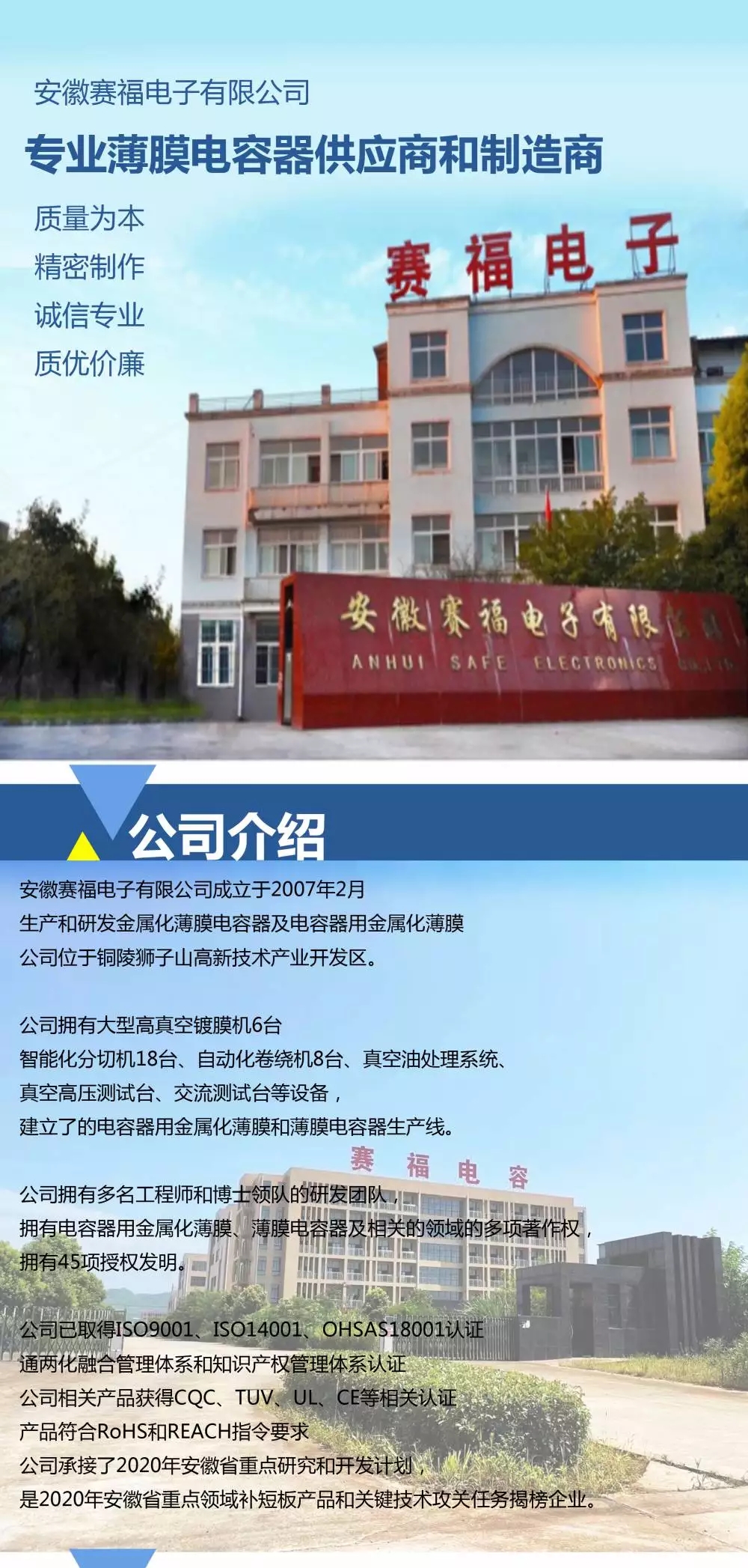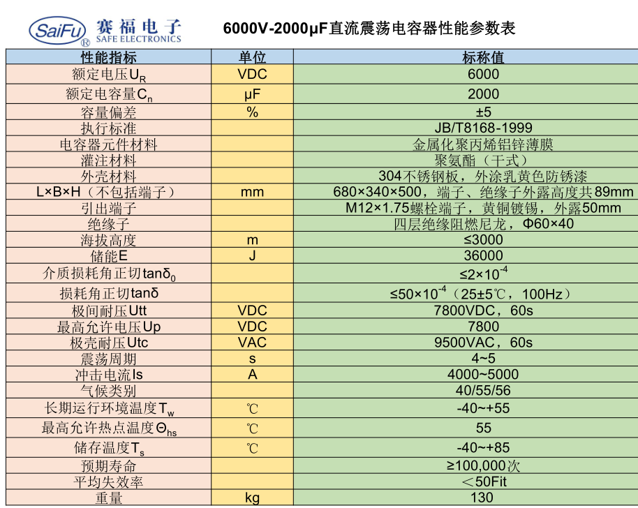 赛福 高压脉冲储能充放电薄膜电容6000VDC 2000UF电容器能够在较长时间内充电,而在较短时间内放电,从而形成一个很大的脉冲功率。脉冲功率的获取是靠已充电的脉冲电容器组,通过主电抗器短时振荡放电获得的,而脉冲电容器组是在试验前由功率不大的充电装置,用较长的时间充电,振荡放电为数十毫秒,从而大大增加了试验功率与电源功率之比,改变了经济效率。
