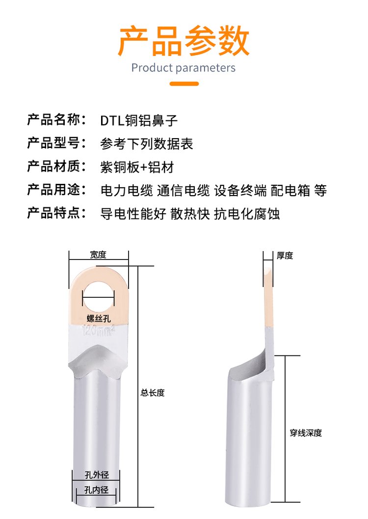 宇益电气DTL-185铜铝接线鼻子圆头铜 铝过渡接头型号铝线接线端子