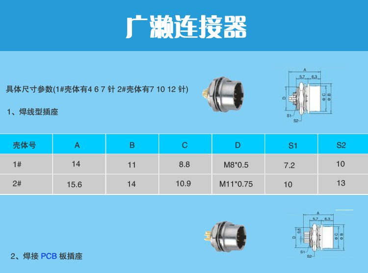 二、插座有焊线型插座、焊接PCB板插座,插头有标准插头,浮动对接型插座(可以与插头对接起到延长线线缆的作用)