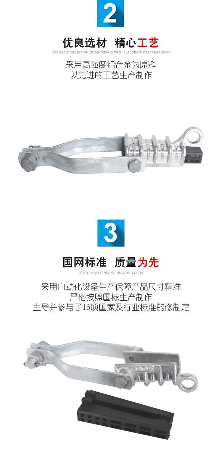 NXJ系列适用于10KV及以下架空绝缘铝芯线的终端货耐张段两端和绝缘子串一起,将架空绝缘导线固定和拉紧。产品按导线规格分别配有不同的塑料楔芯。 结构特点:1.壳体采用抗氧化高强度铝合金铸造,无电能损耗。 2.楔芯采用绝缘增强塑料,工频耐压≥18KV,保证1分钟不击穿。3.电缆不需剥除绝缘层,即可直接安装。 4.楔型结构,安装简单可靠。